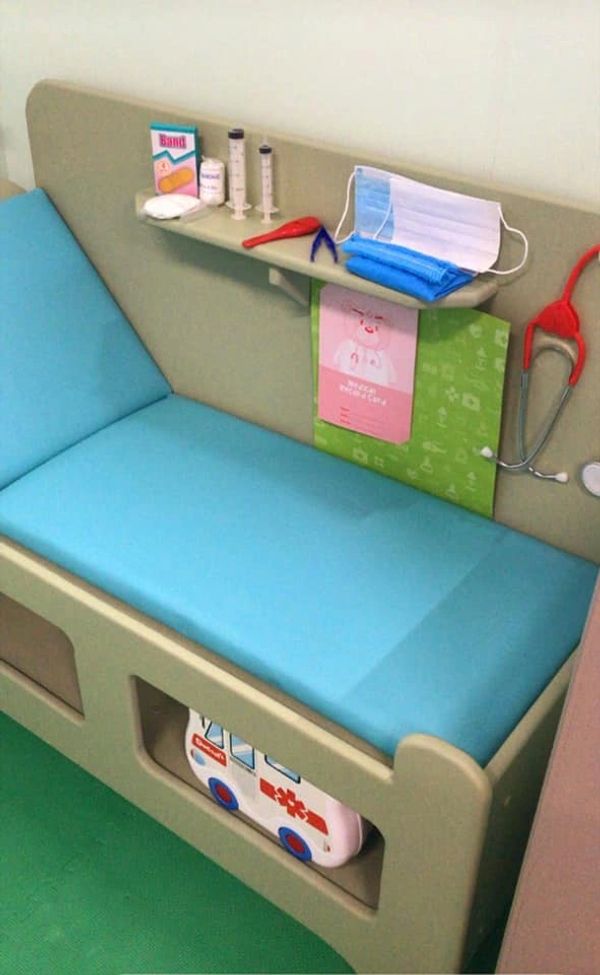 The design is entirely bespoke; whilst wanting a clean, fresh, modern playroom, Laura was mindful of retaining the beautiful traditional features of our old gospel hall.